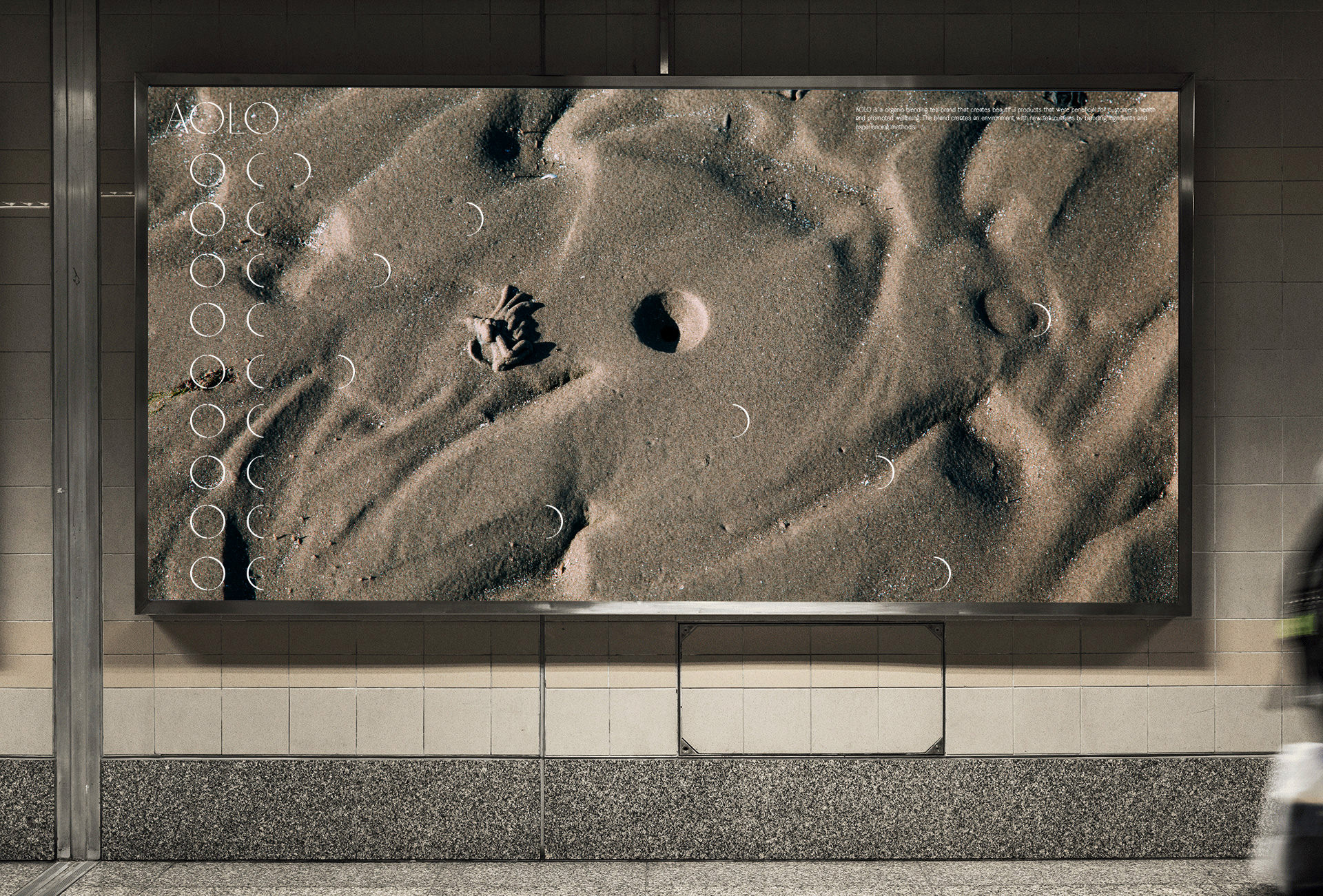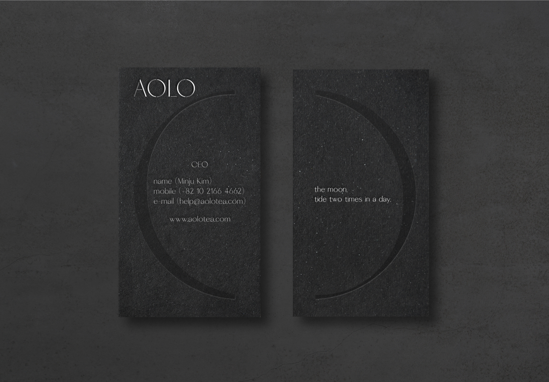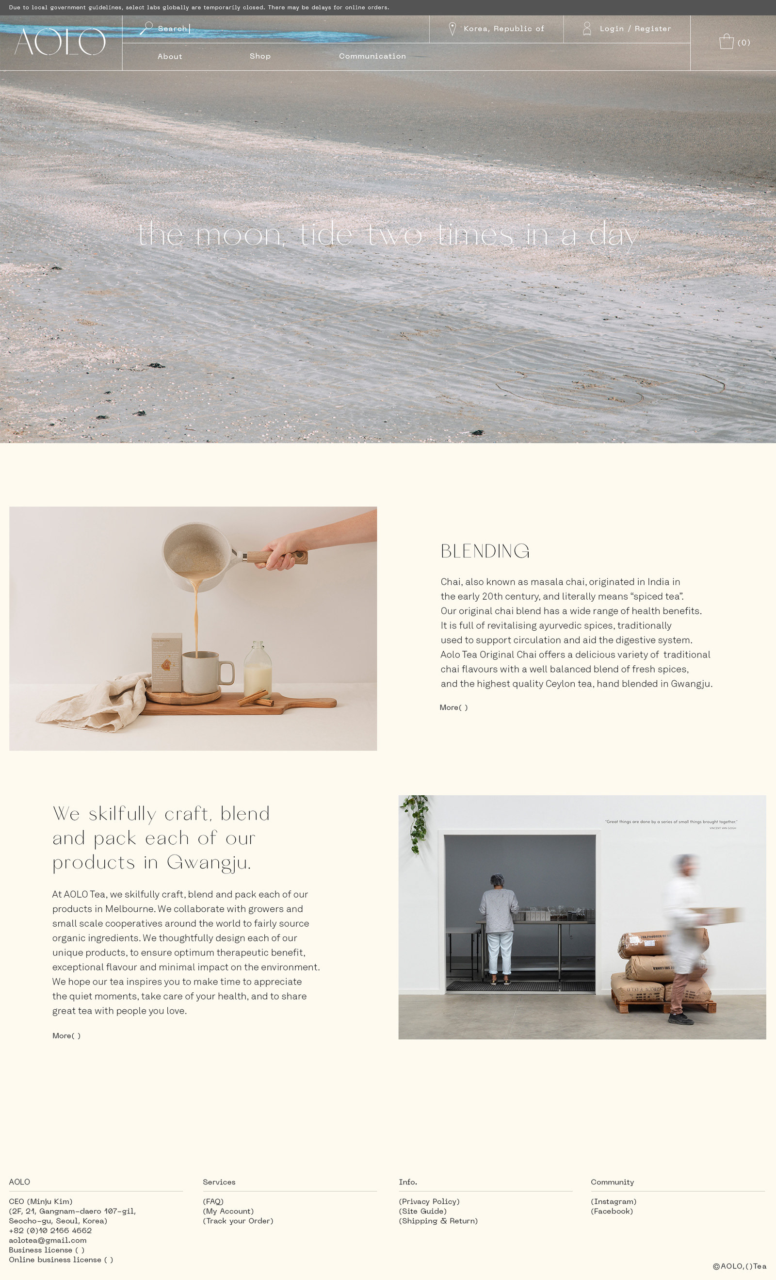 차(tea)브랜드 아올로 브랜딩 총괄, 브랜딩 경험, 로고디자인, 패키지디자인, 비주얼전략 Brand eXperience, BI, Package, Visual strategy AOLO is about ‘Emptiness and fullness’. Bracket symbol is used to represent for openness brand philosophy, mindful messages and names of collaborators. Number system represents how many ingredints are included and blended in a pacakage. It is checked by hand on full numbers . Photography describes to brand image abstractly and emotionally. The moon is photo series, high tides and low tides cause the moon, times and leftover. 아올로는 '어우르다'는 순한글말로, 비움과 체움에 대한 아올로만의 문화와 태도로 만들어진 블렌딩 차(tea) 브랜드 입니다. 괄호는 이와 같은 브랜드의 철학과 생각, 혹은 함께 채워나가는 콜라보레이터를 담는 아올로의 아이덴티티가 되었습니다. 패키지에서 보여지는 넘버시스템은 블렌딩되는 재료들을 나타내며, 수기식으로 체크 할 수 있도록 하였습니다. 달에 의해 만들어지는 밀물과 썰물에 의해남겨진 것들에 대한 포토그래피는 이러한 컨셉을 감성적으로 다가 갈 수 있도록 하였습니다.