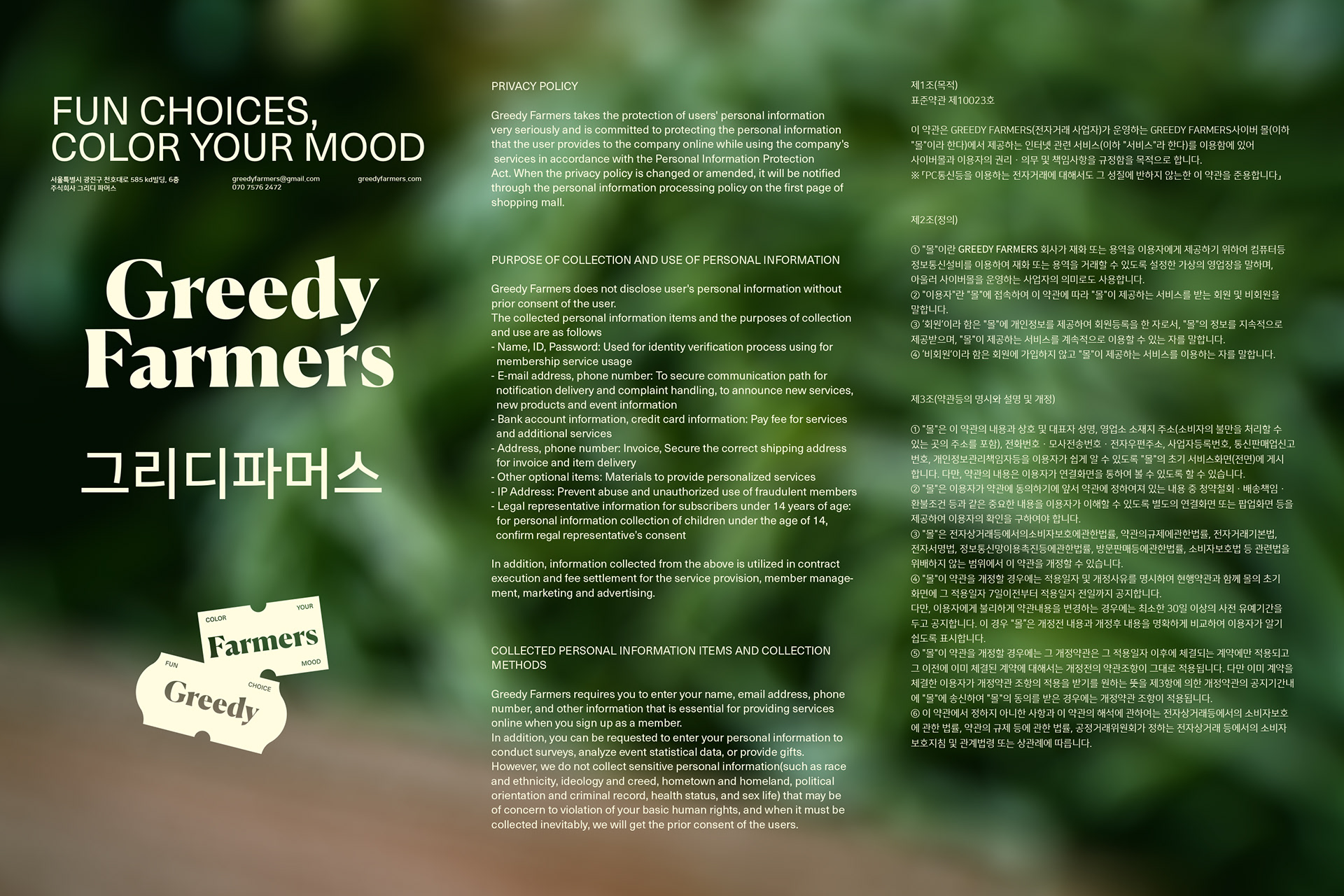 Greedy Farmers is an IT fashion brand, creates inspiring electronic devices cases and desk accessories in office environment. Every members take an active part in ideation, product planning, and company culture. We were inspired by the combination of the ‘culture of plant seeding’ and ‘ideation board’. Just like how plants needs to transplanted in a certain distance, in order to grow well, we take healthy amount of time in product planning. It allows us to offer competitive price point to our customers. So, We developed collage style of design system, that showcases product images, and information in various medium to communicate with them. 욕심 많은 농부라는 이름을 가지고 있는 IT 패션 브랜드, 그리디파머스는 사원들의 폭넓은 참여와 아이디어를 적극적으로 담아 상품 기획부터 사내 문화까지 함께 만들어가는 능동적 기업문화를 가지고 있습니다. 저희는 이러한 문화를 '모종 심는 방식'과 '아이디어 보드'를 결합한 디자인시스템을 생각해 보았는데요, 함께 참여하는 협동을 기반으로, 건강하게 모종이 자라도록 일정한 거리를 두고 심는 모내기 방식처럼, 오랜시간동안 건강하게 기획된 제품을 소비자들이 합리적인 가격으로 만나 볼 수 있도록 다양한 미디엄과 컨셉에 따라, 스토리와 제품정보 및 컨텐츠 등을 유기적으로 조합하여 커뮤니케이션 할 수 있도록 하는 콜라주형 디자인 시스템을 개발하였습니다.