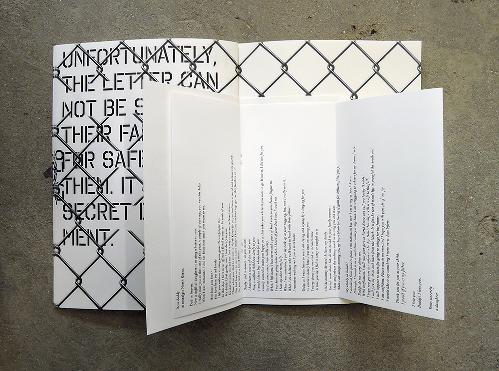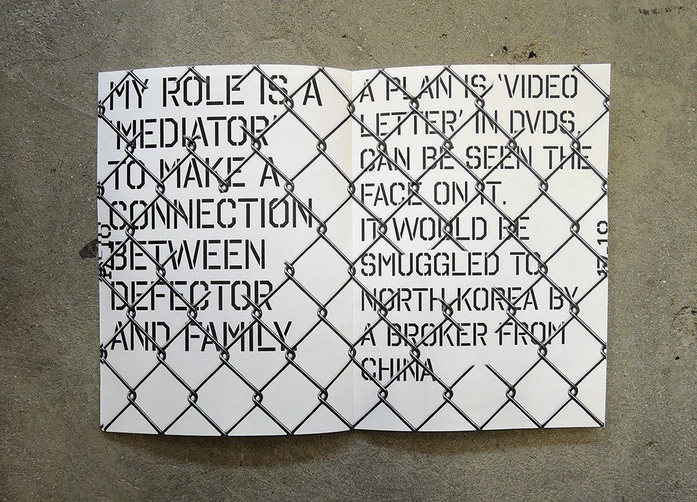 Process book The isolated country of North Korea has always sparked interest. With the lack of information and media images, outsider fascination grows. Yet this produces a distortion of reality, alongside precarious assumptions and exaggerated generalisations. An alternative to this understanding is experiential learning - a process of involvement and emotional investment. Within the regime, the defectors and their families left in North Korea are disconnected- coming face to face is impossible, and calling each other is dangerous to both parties as strict surveillance is quick to label rebels to the state. In this complex circumstance, how can design socially contribute to the political situation? In an effort to answer this question, this project acts as a mediator and communicator between those isolated outside the country and their family inside. Concurrently, this is a criticism of the North Korean regime through personal and tragic life stories, with a purpose of improving the disconnected North Korean family network, as well as South Koreans with North Koreans, and wider audiences through experimental learning. CSM Degree show 2016 http://2016.csmcommunicationdesign.com